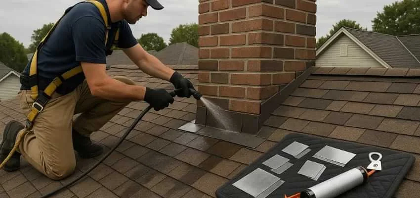 We examine crown slope, cap fit, mortar joints, brick or stone surfaces, and flashing transitions at the roofline. In Wildwood, Georgetown this area is often the origin of leaks.